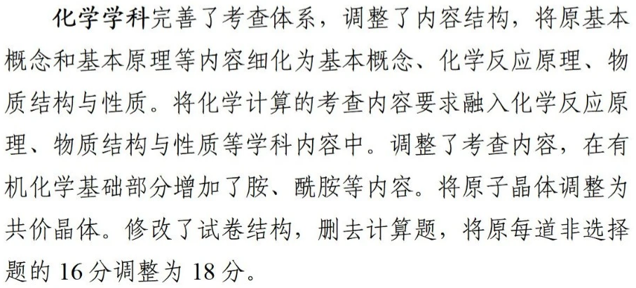 总体来说,化学学科跳出碎片化学习模式,转向深度理解与跨领域应用,进一步考查细化概念与计算能力,体系重构,内容深化。