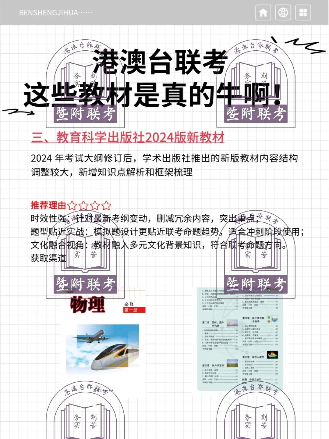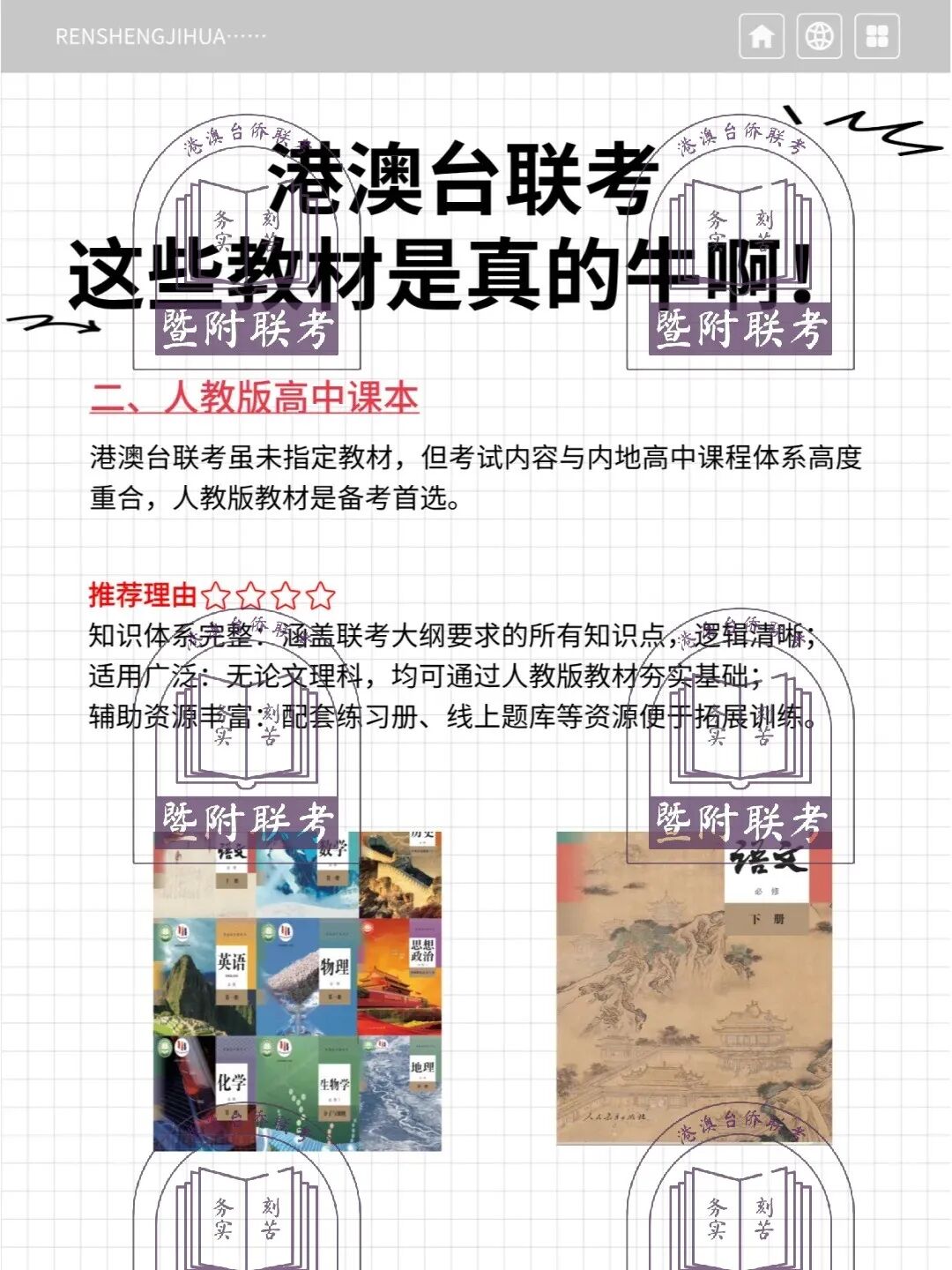 尽管港澳台联考未指定特定教材,但其考试内容与内地高中课程体系高度一致,因此人教版教材成为备考的首选。
