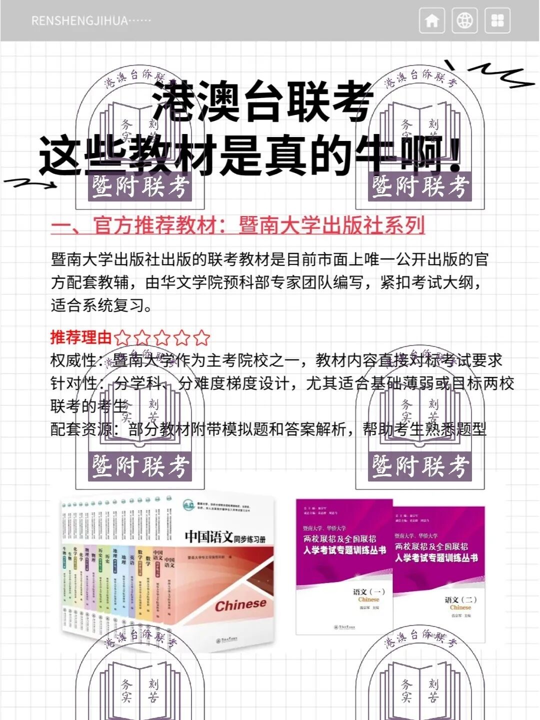 暨南大学出版社所出版的联考教材,是目前市面上唯一公开出版的官方配套教辅。该系列教材由华文学院预科部的专家团队精心编写,紧密贴合考试大纲,非常适合进行系统性复习。