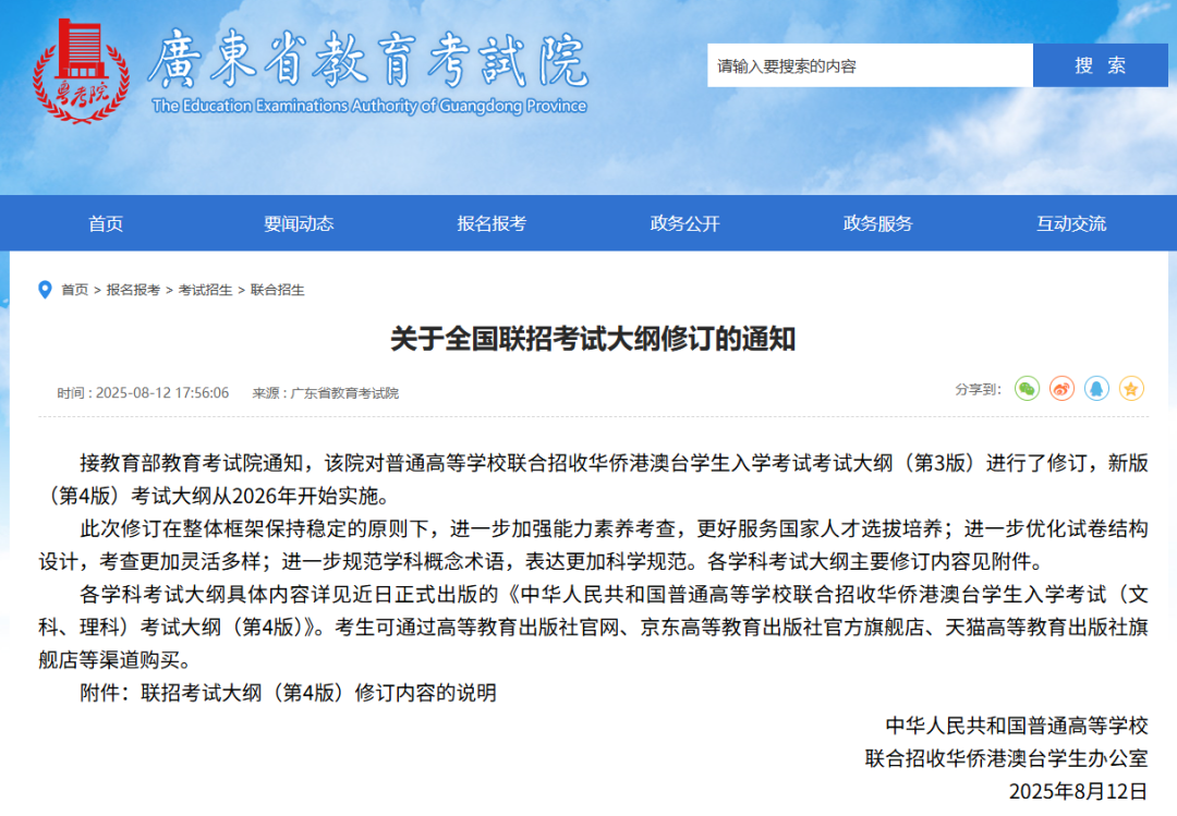 根据教育部教育考试院最新公告(2025年第4版),港澳台侨联考自2026年将全面实施新版大纲。这轮调整并非简单题型微调,而是聚焦“能力素养”,强调知识迁移和实际应用。例如中文科目古诗文比例提升、情境化题目增加;数学加入概率运算、多项式等内容,同时选择题数量减少但分值提高;英语取消短文改错,引入概要写作和语法填空,更贴近国际主流测试趋势。
