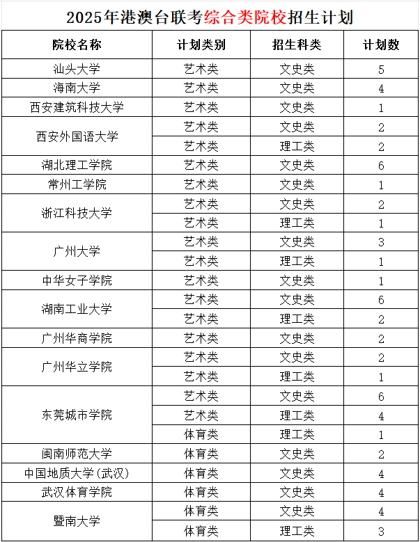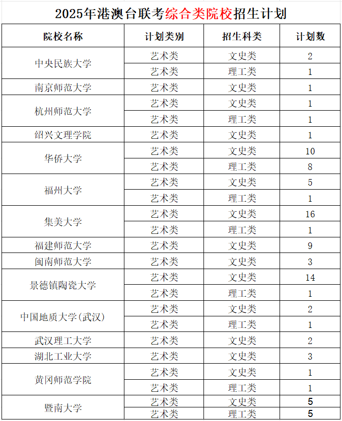 2025年港澳台联考综合类院校招生计划