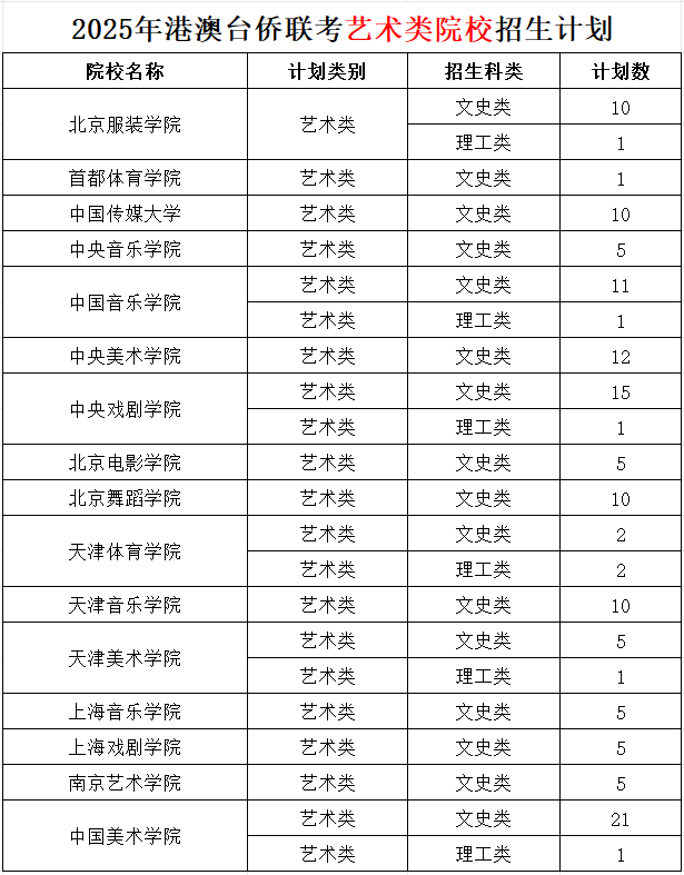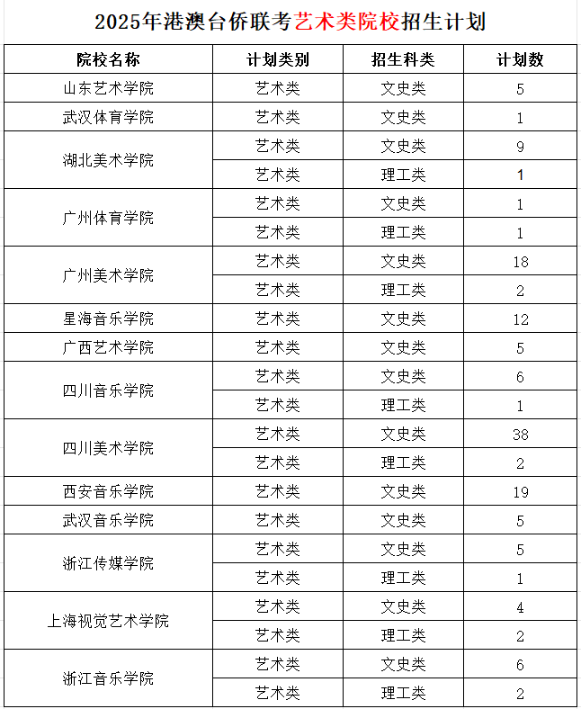 2025年港澳台侨联考艺术类院校招生计划