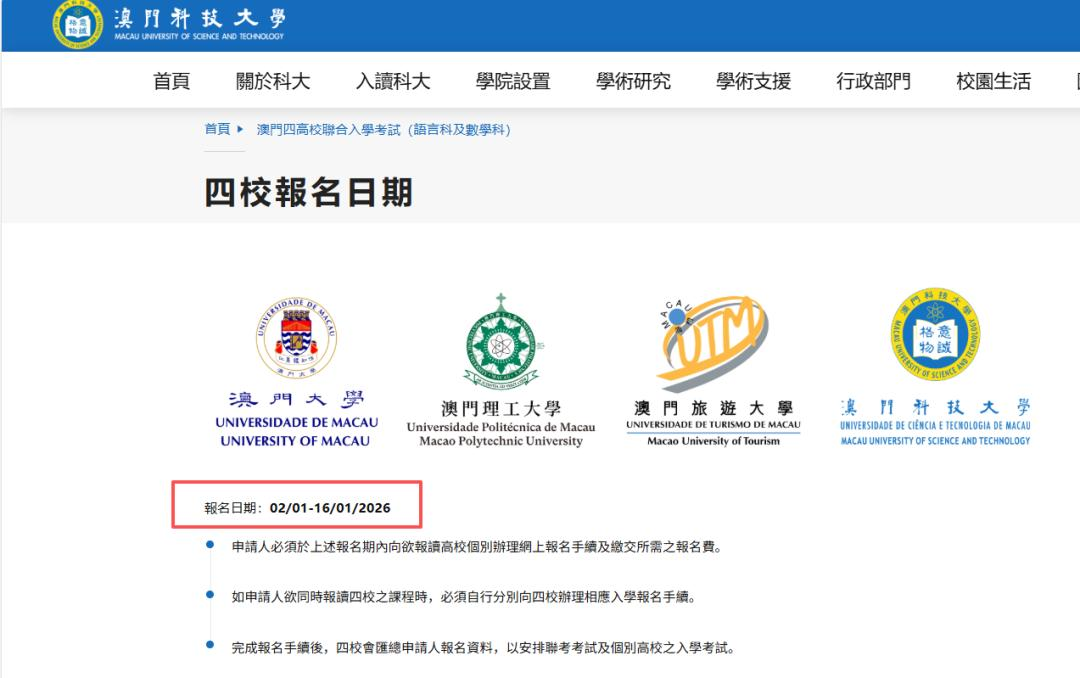 澳门大学、澳门理工大学、澳门旅游大学及澳门科技大学联合组织的"澳门四高校联合入学考试",已正式发布2026学年报考日程,还有10天正式开启。