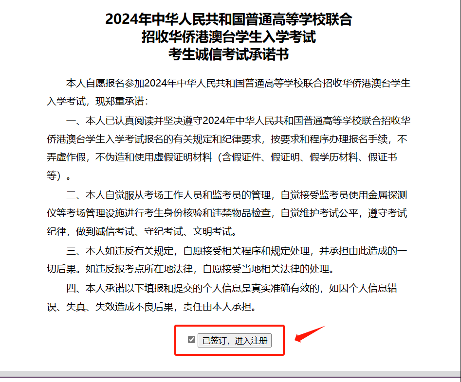 >浏览考生诚信考试承诺书,勾选底部【已签订,进入注册】前面的小方框。