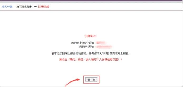 >跳转页面后,页面显示网上报名号及密码,可自行截图或拍照记录。随后点击底部【确定】按钮。